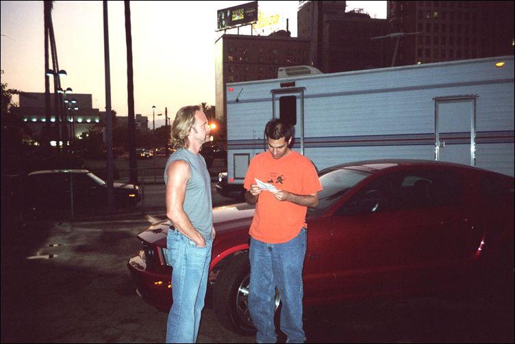 Heath helps Lee run his lines. That's Lee's shiny new Mustang behind them.