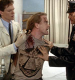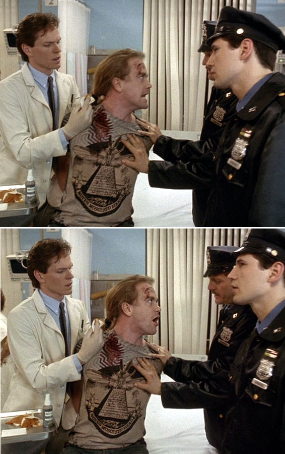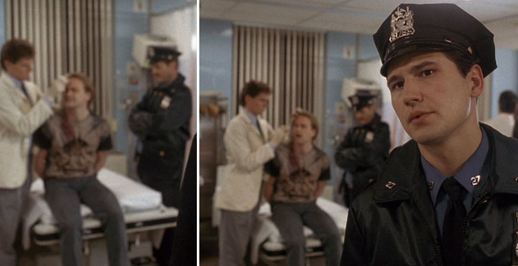 an emergency room. The camera pauses on pony-tailed, hand-cuffed Lee